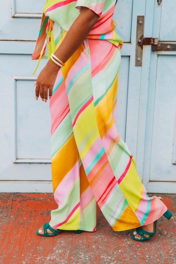 Un pantalon fluide et large avec une taille élastique ainsi qu’un noeud afin de le resserrer à votre convenance.