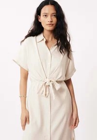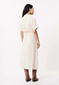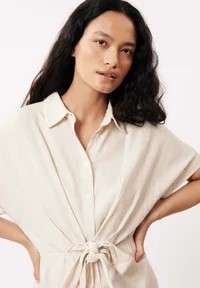 – Robe midi à manches courtes – Col chemise – Patte de boutonnage – Ceinture à nouer au niveau de la taille – Composition : 40% Viscose, 35% Polyester, 25% Linen – Conseil d’entretien : Lavage délicat à 30°