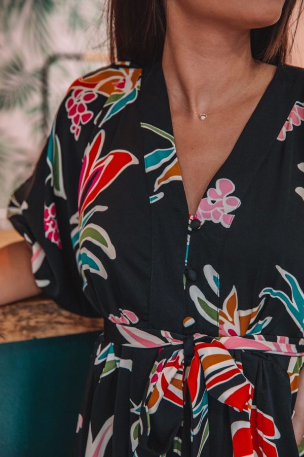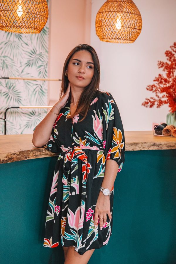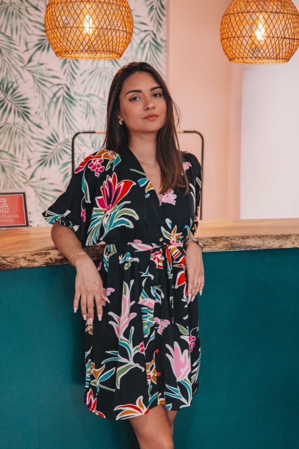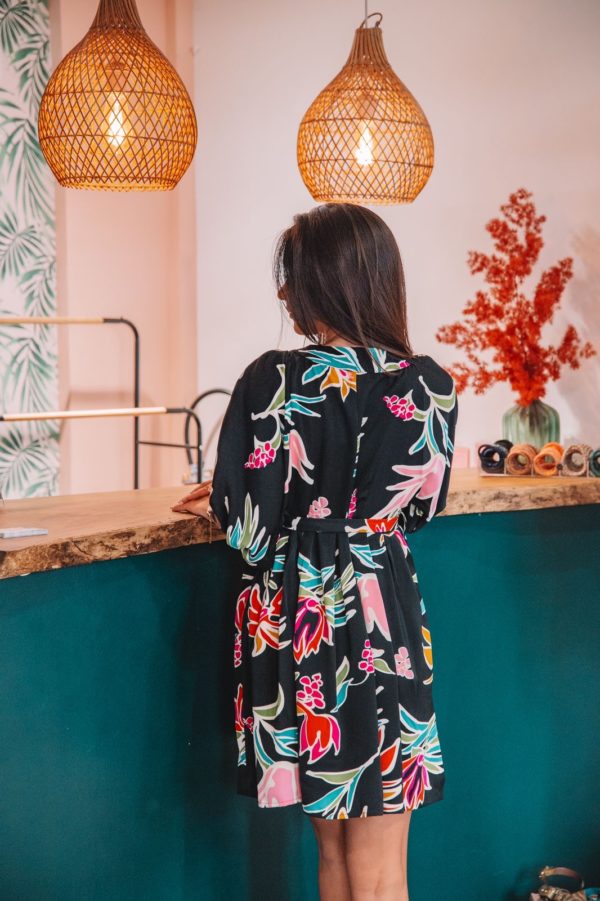 Mini robe-chemise en imprimé floral sur fond noir, fermeture à boutons sur le devant et manches ballons pour un look bohème, ceinture à nouer.