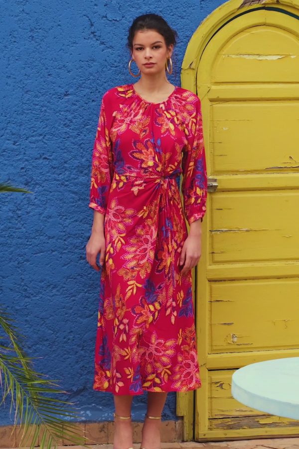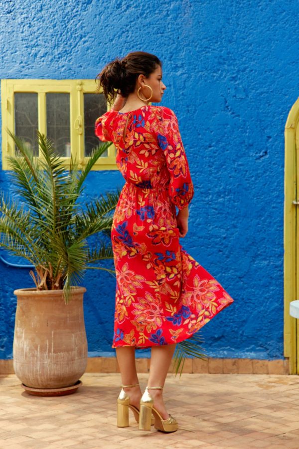 – Robe midi colorée – Imprimée floral – Manches 3/4 – Encolure ronde – Ouverture ronde à la taille resserrée par un lien – Modèle déposé