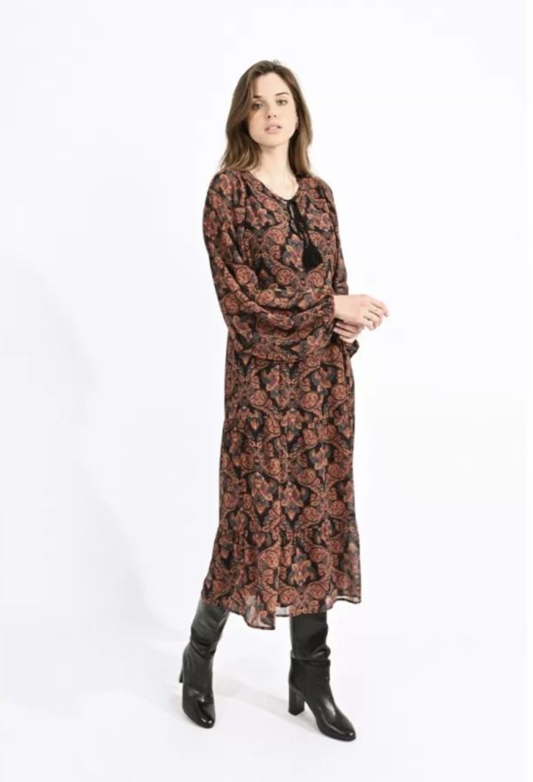 Maxi robe au volume généreux pour une élégance naturelle. Motif cachemire sur fond noir, et emmanchures chauve-souris.