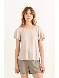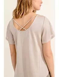 Top de forme droite, ample, au bas arrondi. Matière souple et légèrement irisée. Encolure arrondie et liens croisés au dos.