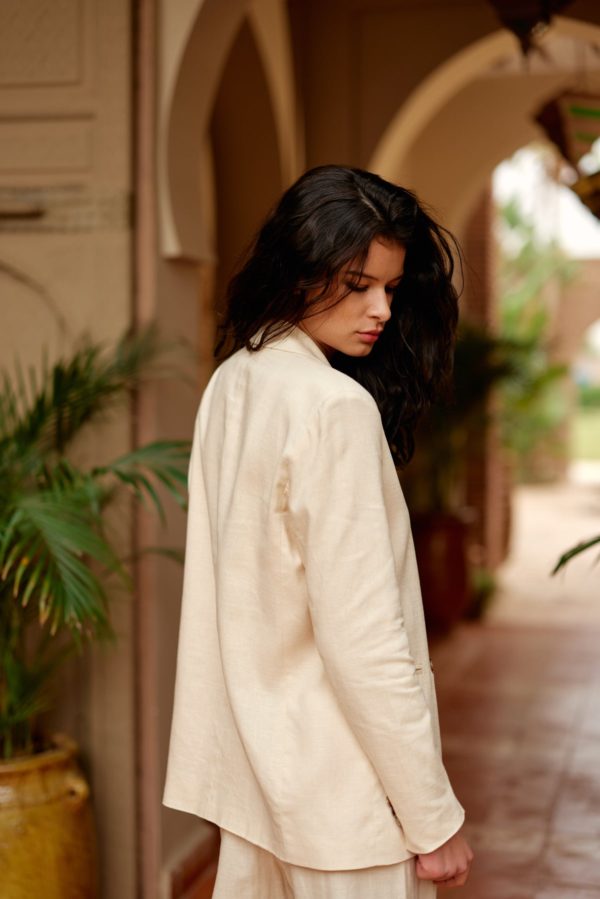 – Veste croisée double boutonnage – Boutons recouverts – Col tailleur – Poignets avec boutons – Poches avec rabats – Modèle déposé